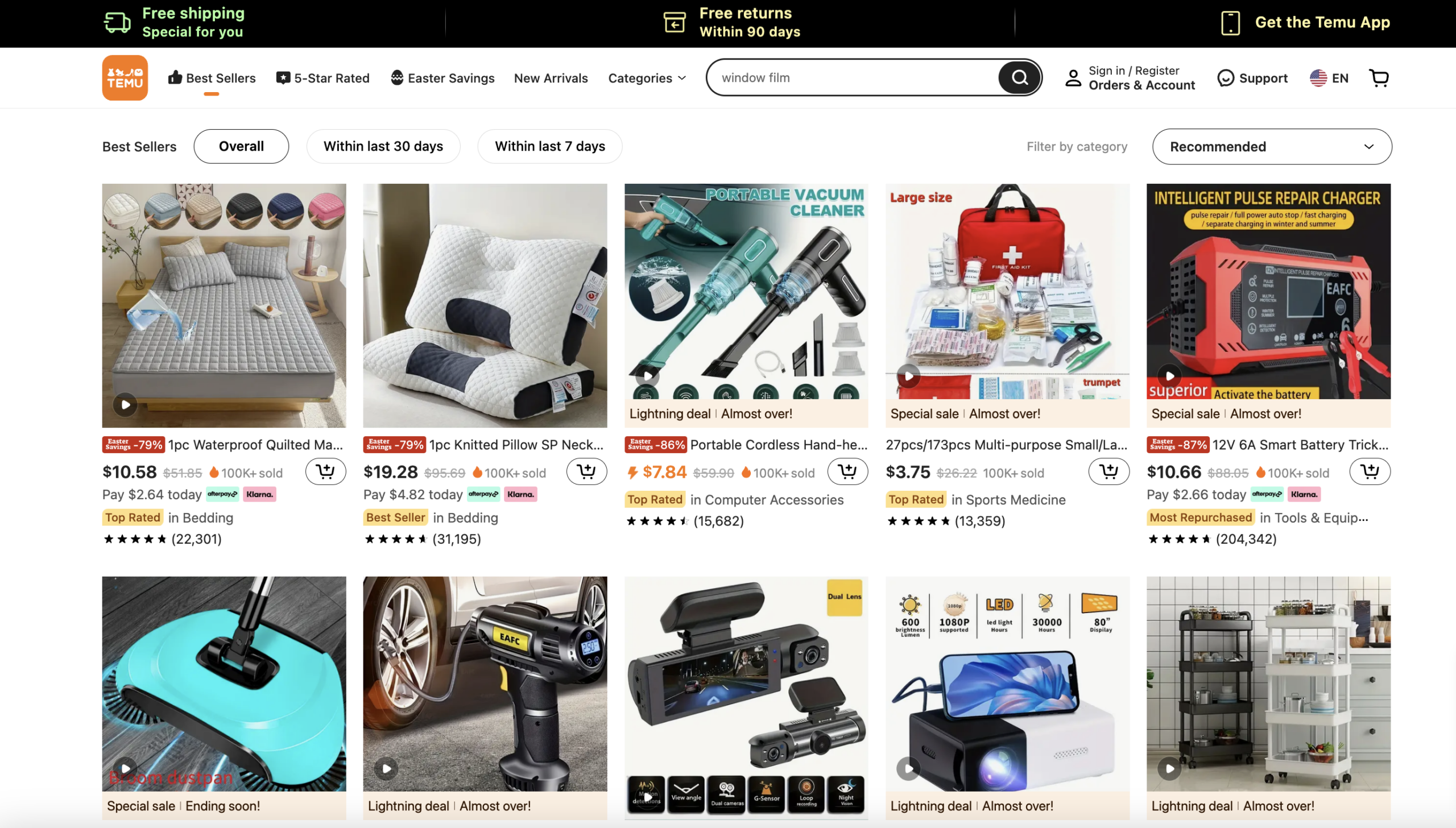 With over 30 million downloads per month, saying Temu is popular seems like an understatement. Its app is centered around dynamic pricing—prices get lower as more shoppers buy a particular item. In fact, that’s where its name (sort of) comes from: ‘Team Up, Price Down.’ Free shipping and free 90-day returns apply to all items.